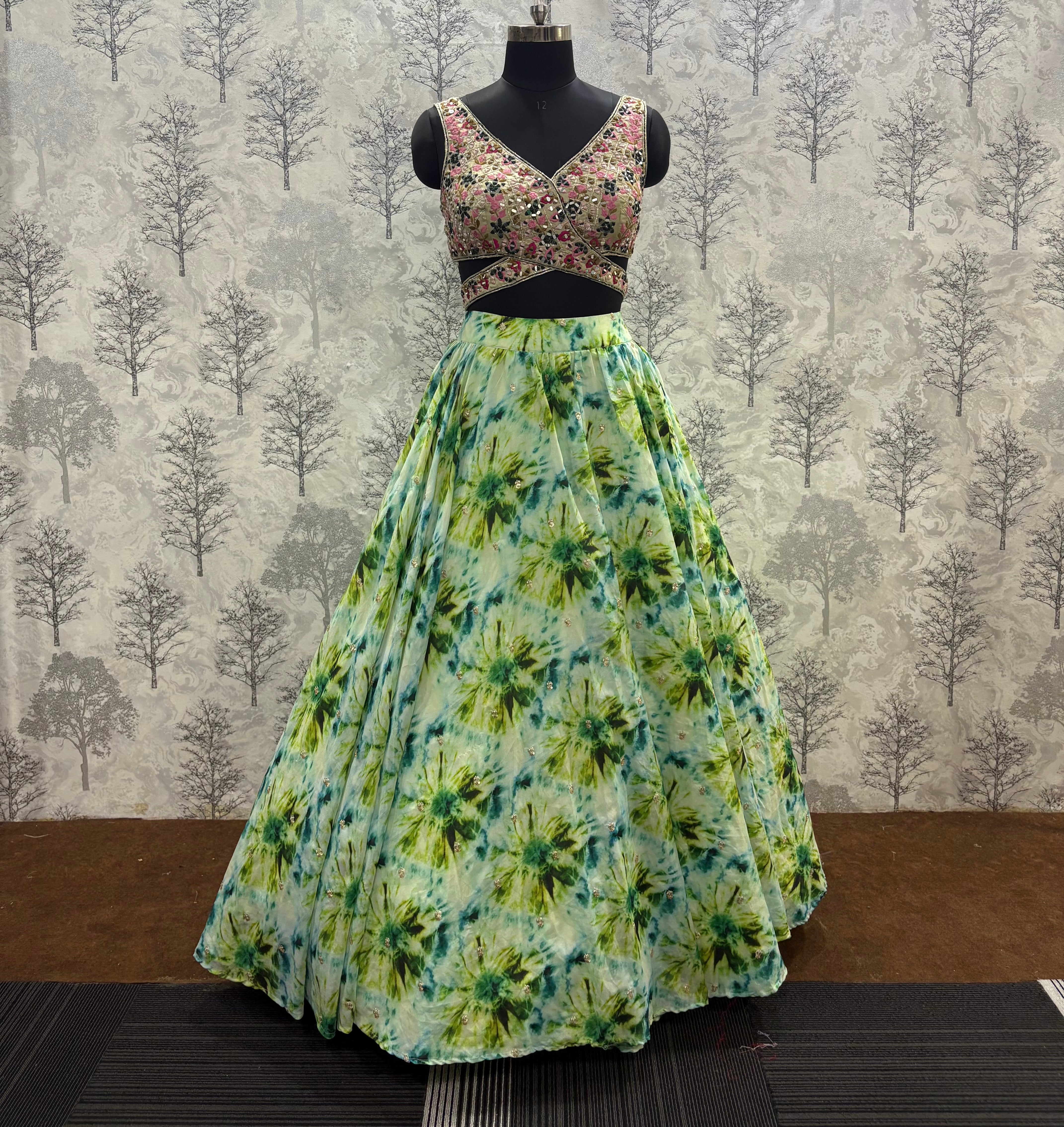 Turn heads at every celebration with this stunning Multi-Dye Printed Chinnon Lehenga Set, crafted from lightweight chinnon fabric for a flowy, comfortable feel. The lehenga features a beautiful multi-dye effect with all-over prints and a defined border, giving it a vibrant, festive appeal.