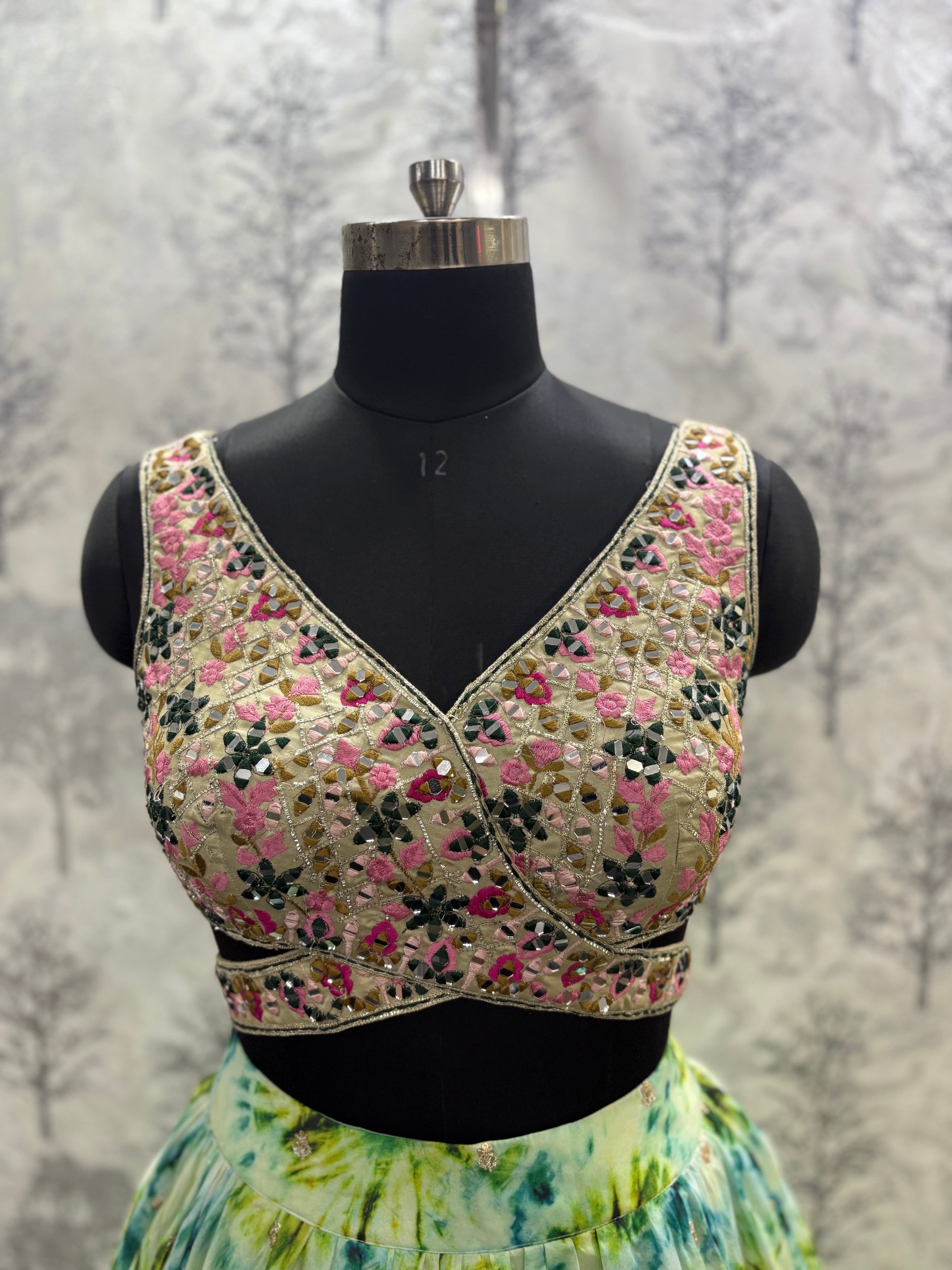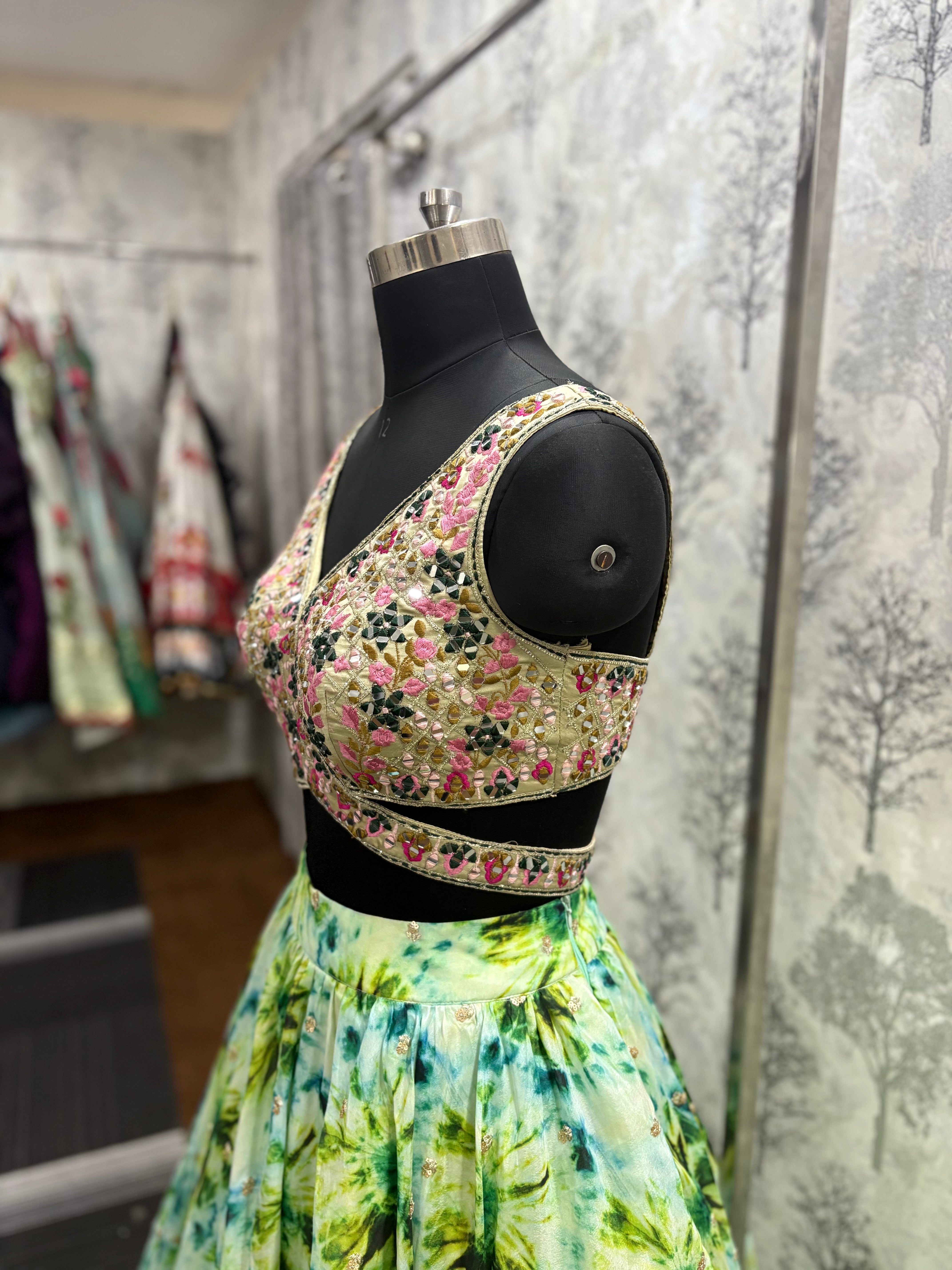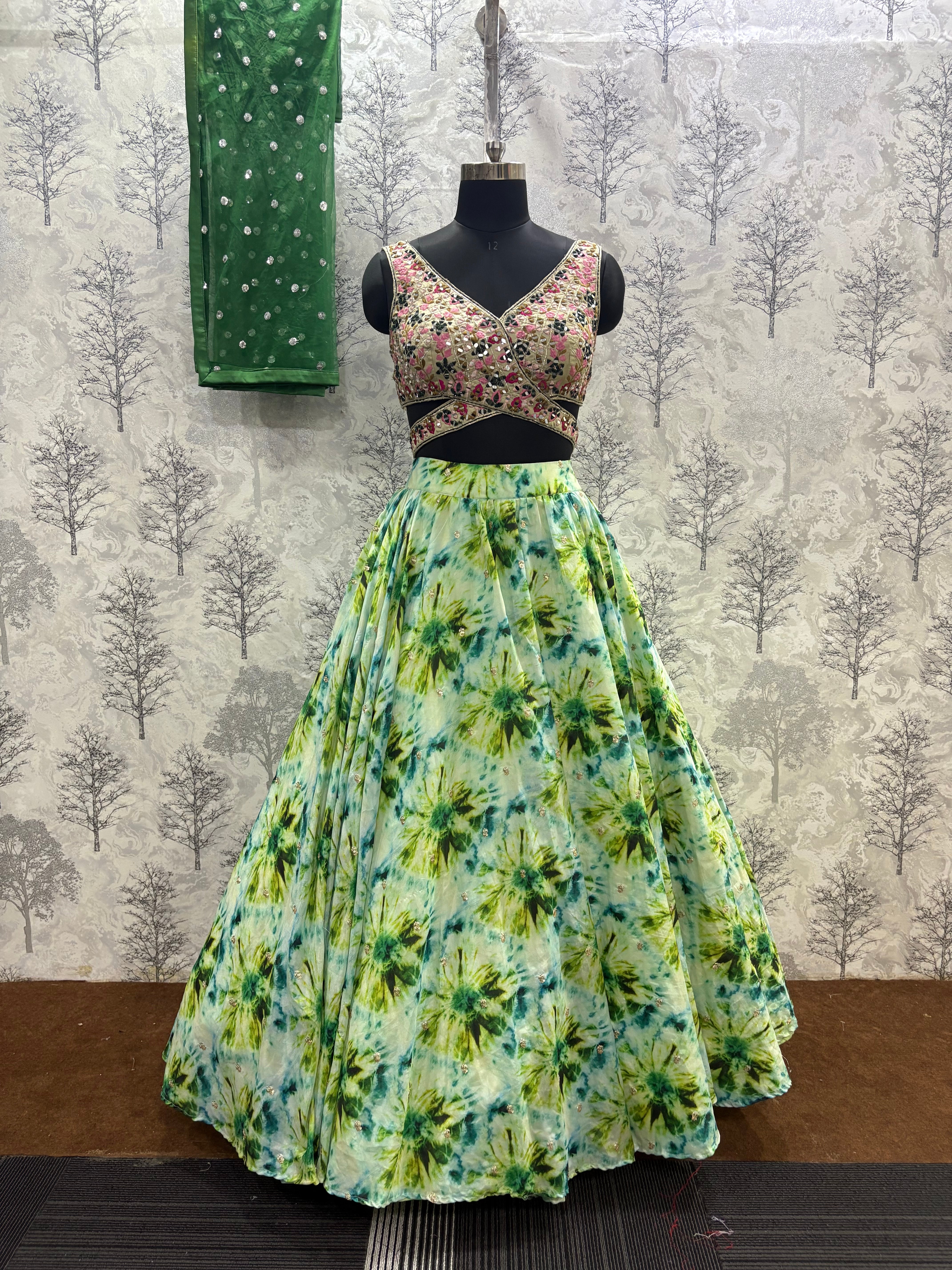 Multi-Dye Printed Chinnon Lehenga Set with Mirror Work Blouse & Butti Dupatta