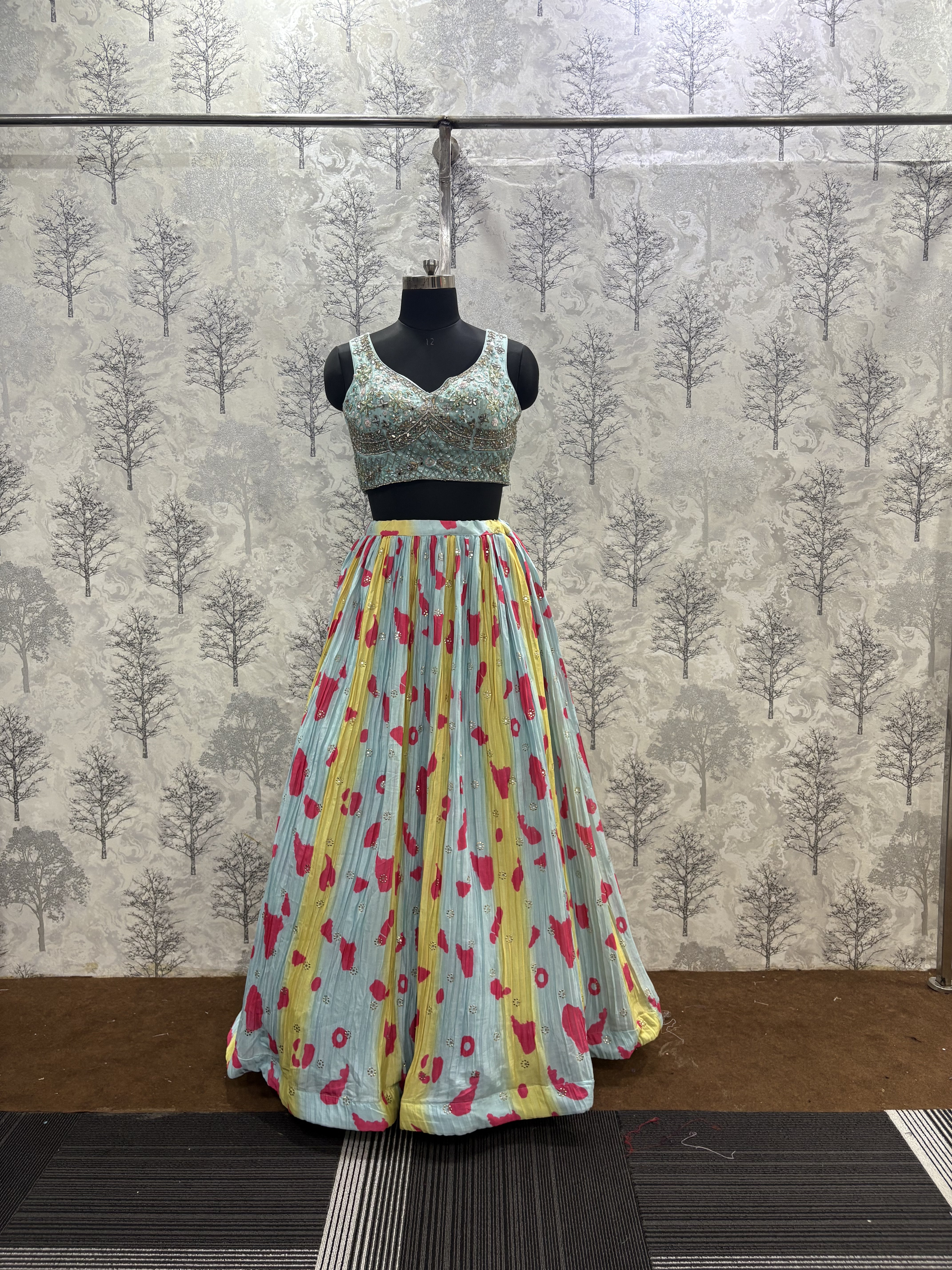 Lehenga: Printed all over with a crushed texture for added elegance