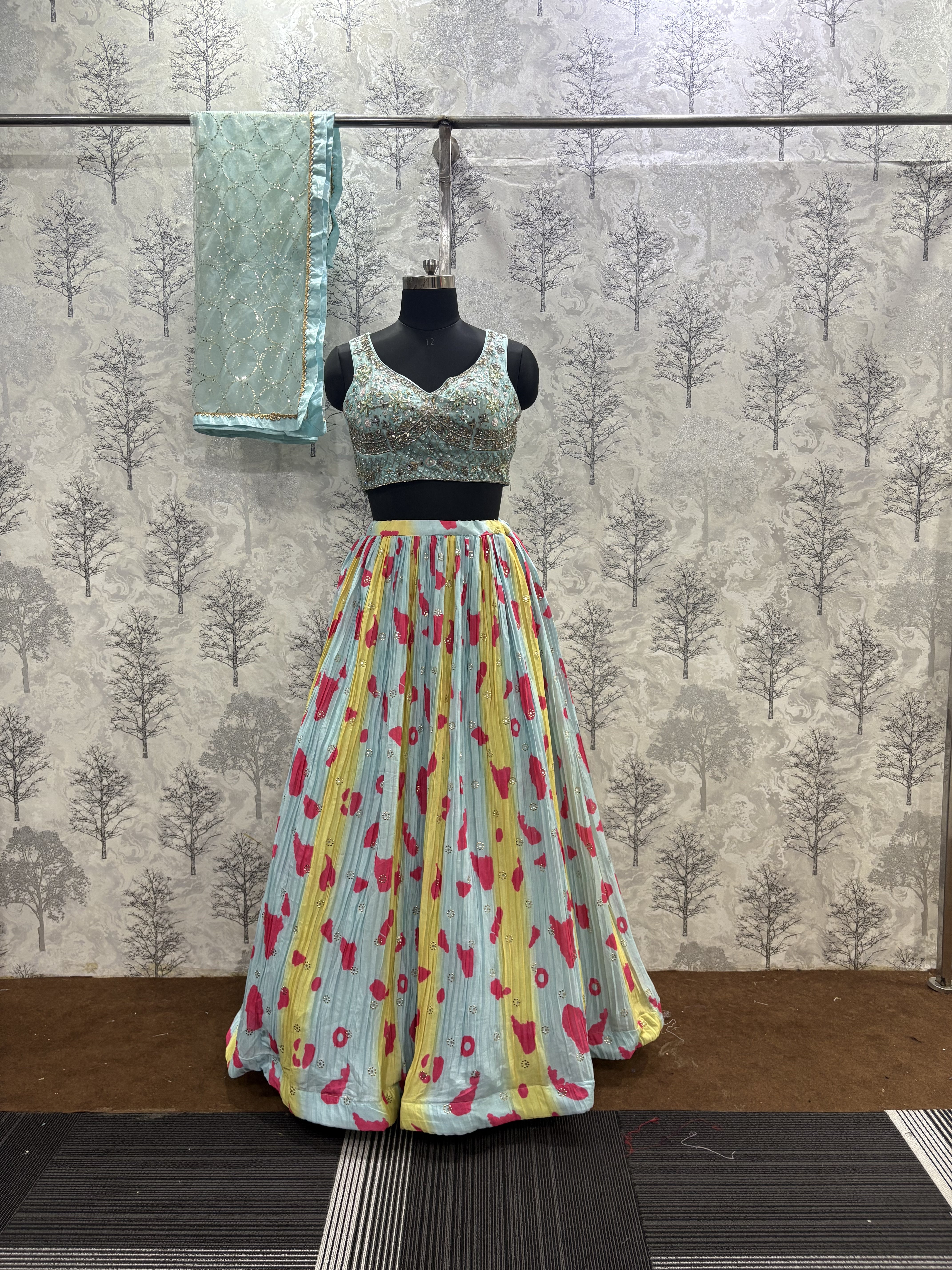 Grace meets glamour in this elegant Crushed Chinnon Lehenga Set, crafted for women who love light, breathable ethnic wear with a luxurious finish. The lehenga is made from lightweight crushed chinnon fabric with all-over prints, offering a rich texture and graceful flow.