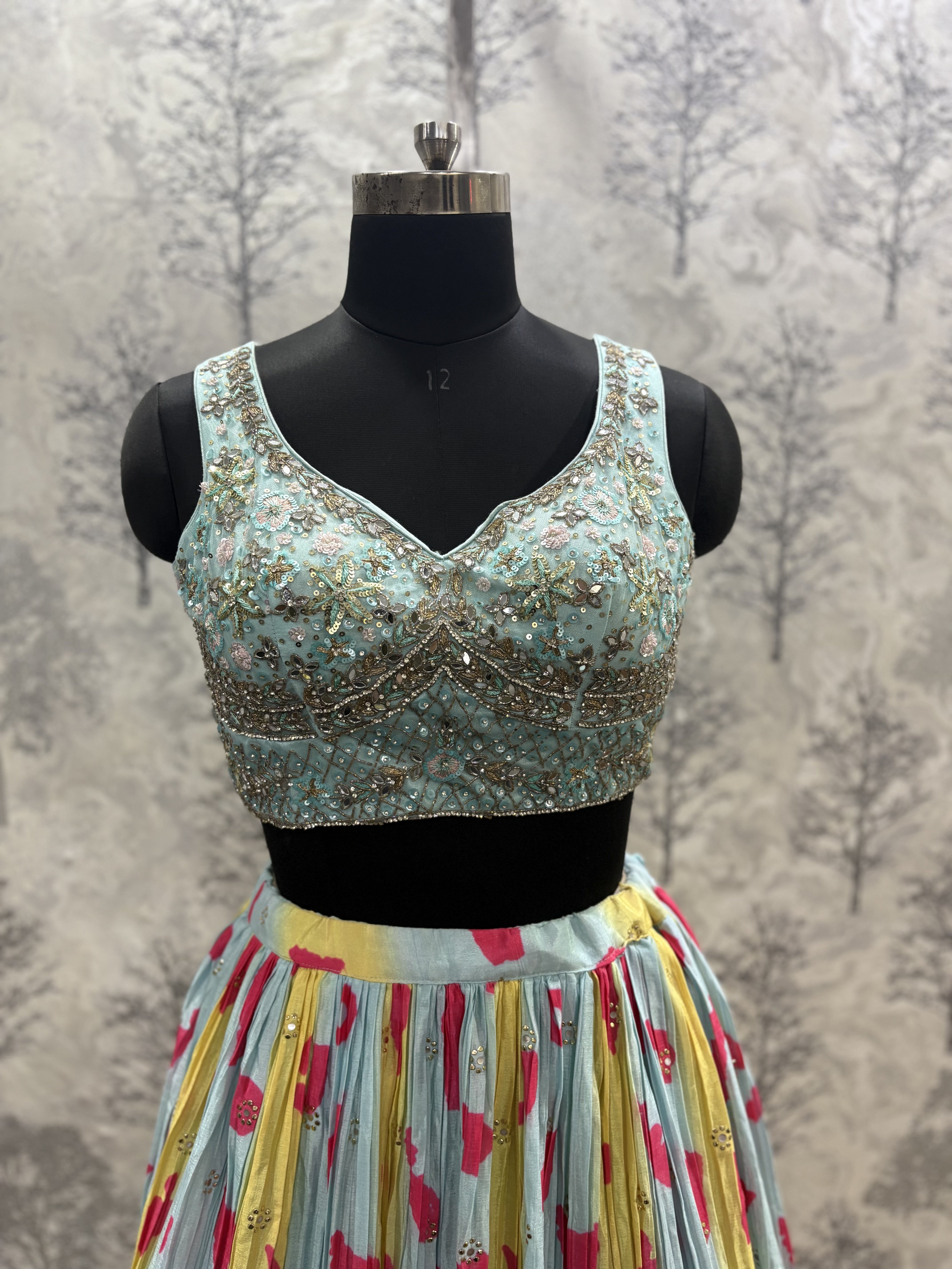 Crushed Chinnon Printed Lehenga Set with Hand Embroidered Blouse & Sequin Net Dupatta