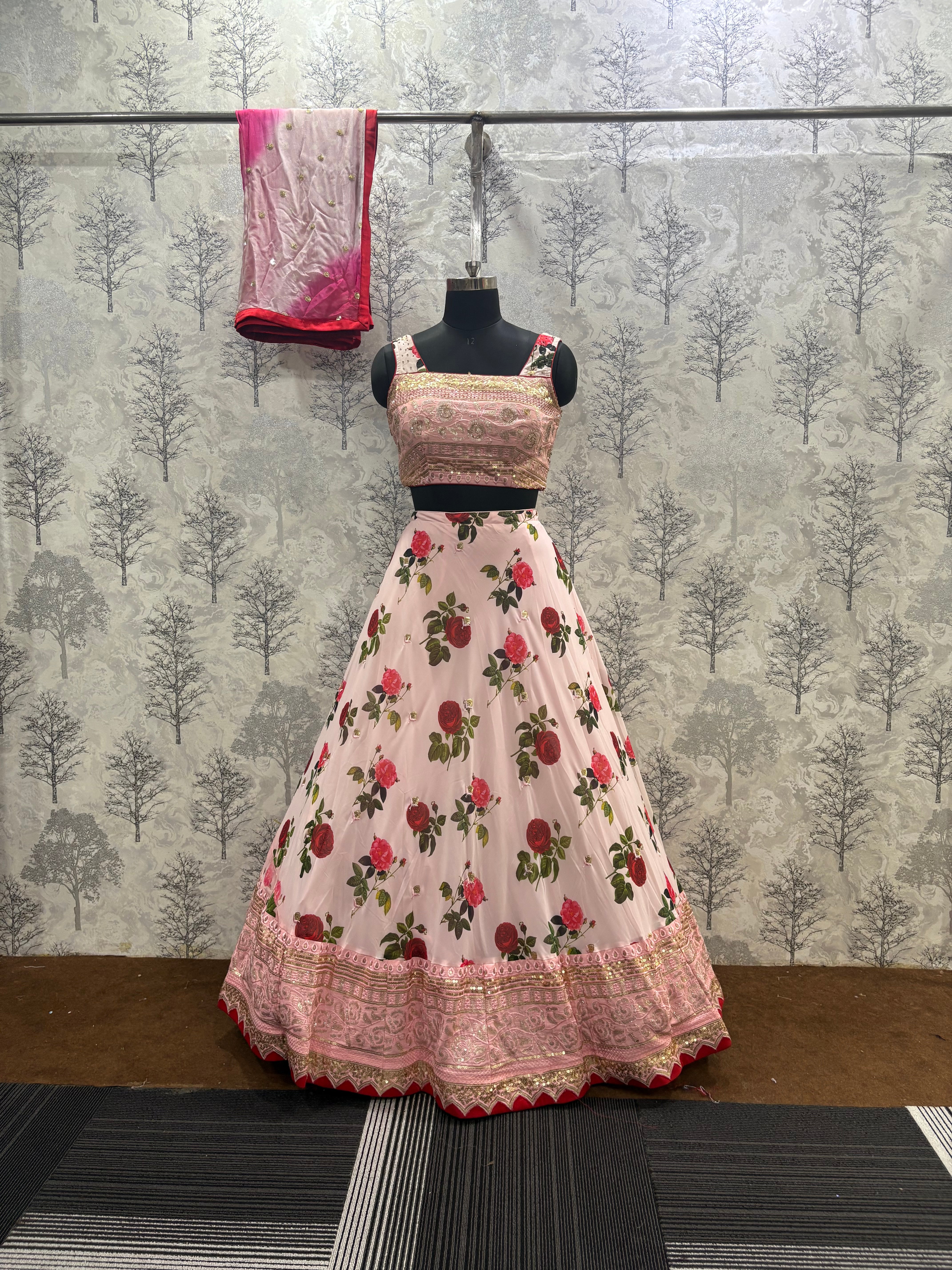 Elegant Printed Chinnon Lehenga Set with Heavy Border & Dupatta